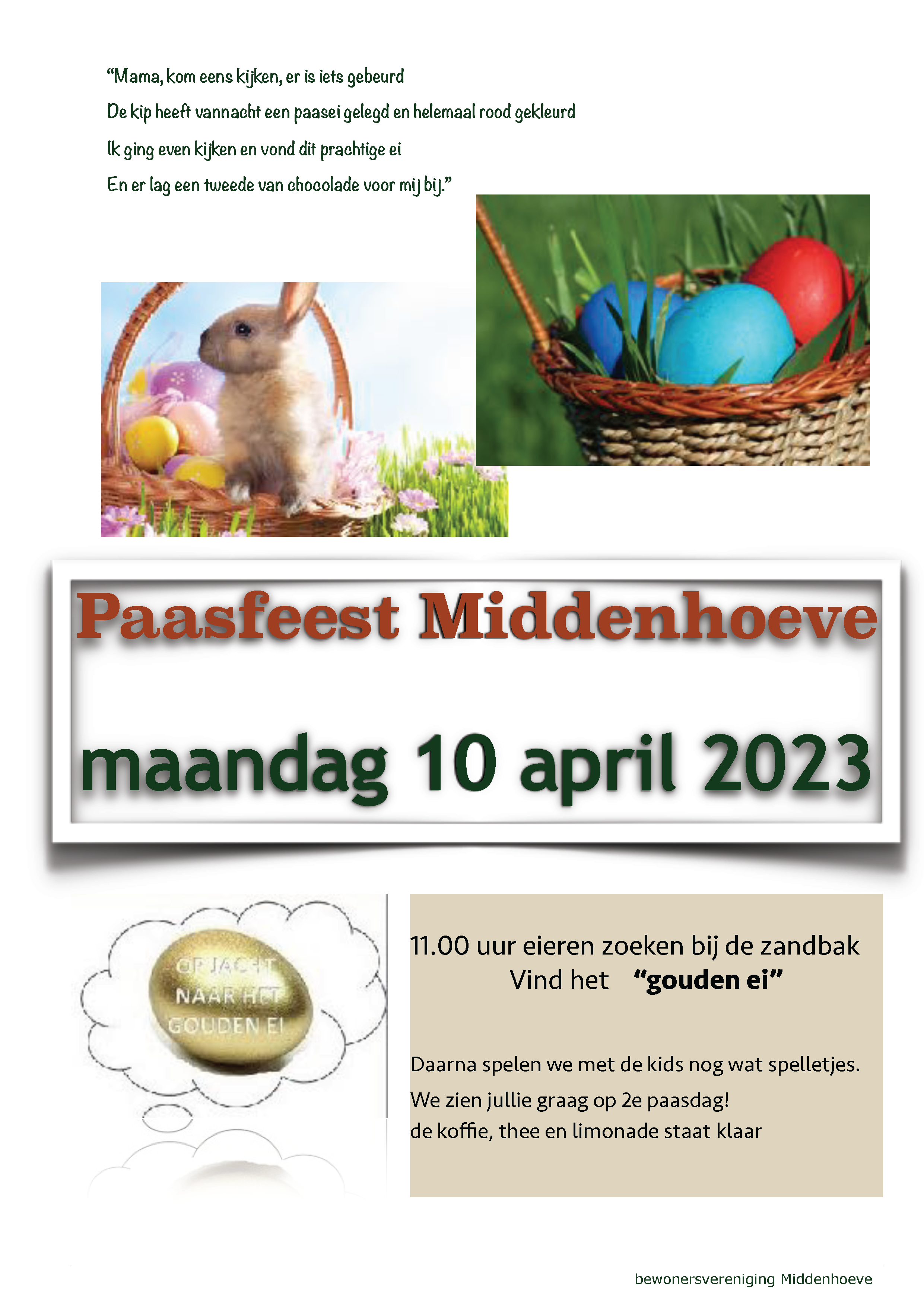 Bestuur Vieringen april 10, 2023 maandag 10 april 2023 11.00 uur eieren zoeken bij de zandbak Vind het “gouden ei” Daarna spelen we met de kids nog wat spelletjes. We zien jullie graag op 2e paasdag! de koffie, thee en limonade staat klaar